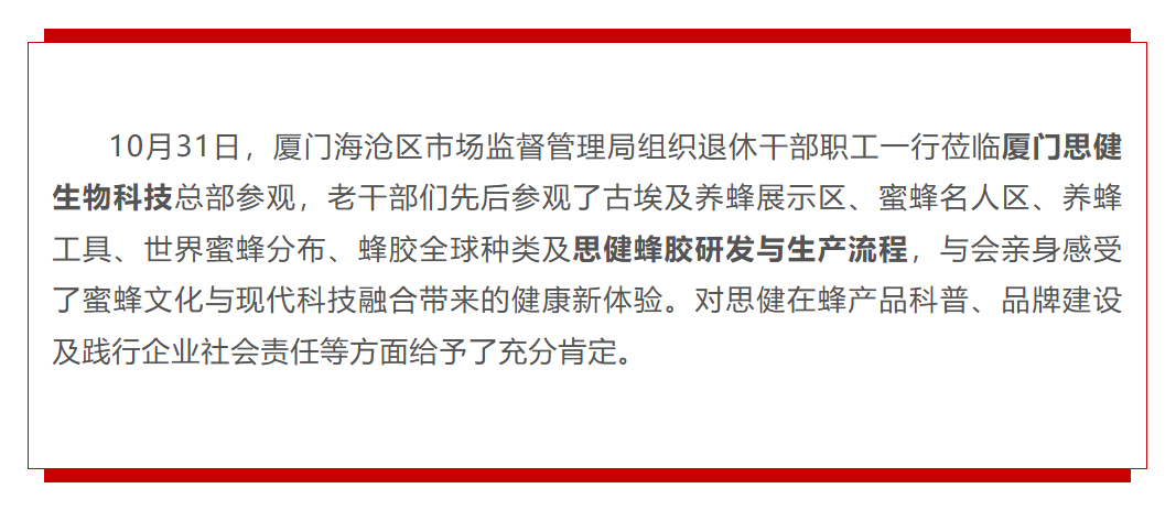思健科技動(dòng)態(tài) | 海滄市場監(jiān)督管理局退休干部職工參觀思健蜂主題科技館及蜂膠生產(chǎn)車間